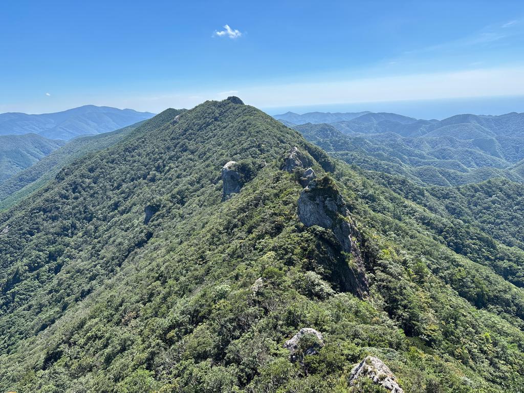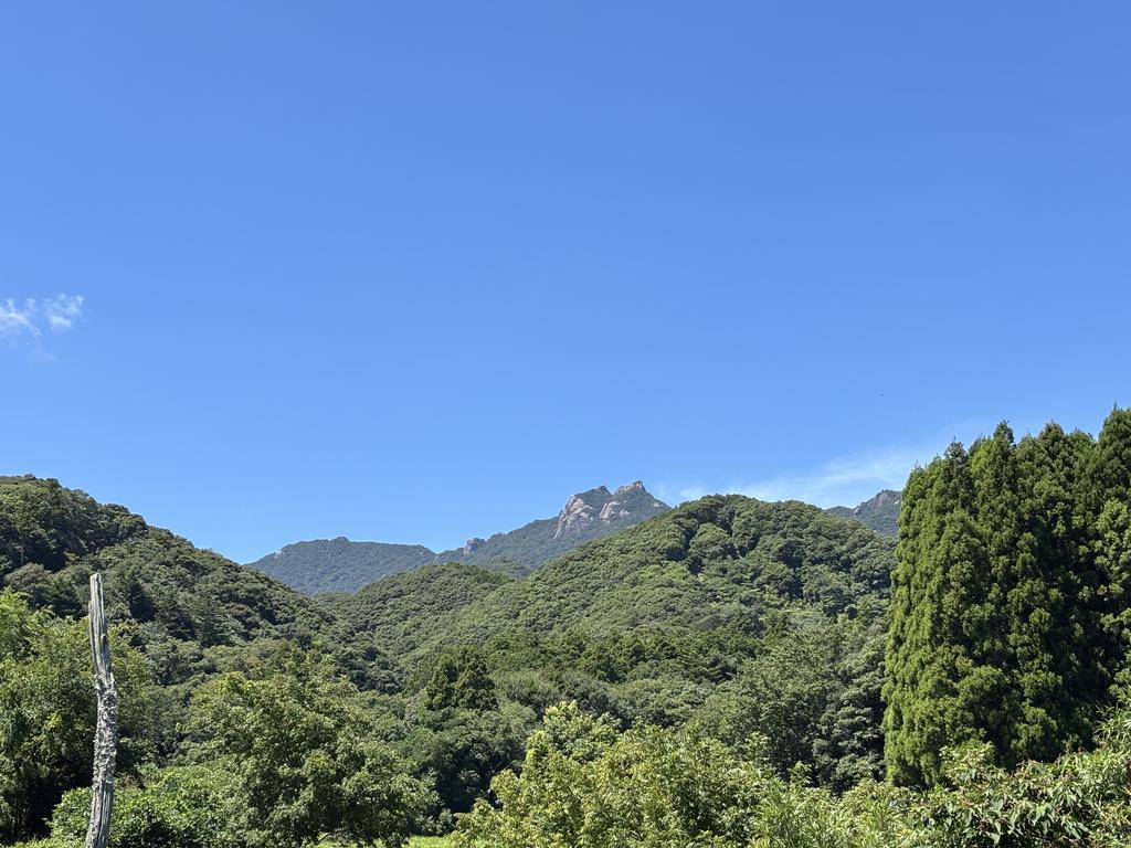 写真は8月17日(日)、登山口がある洲藻(すも。長崎県対馬市美津島町)の登山者用トイレ・駐車場からの白嶽遠望です。