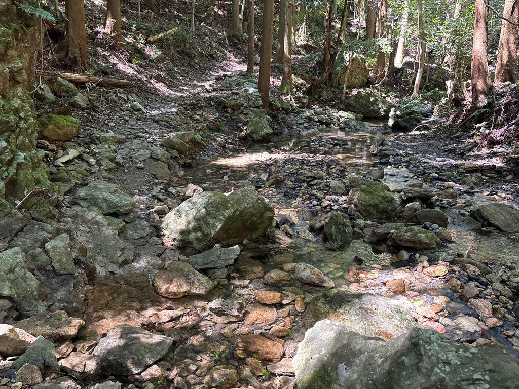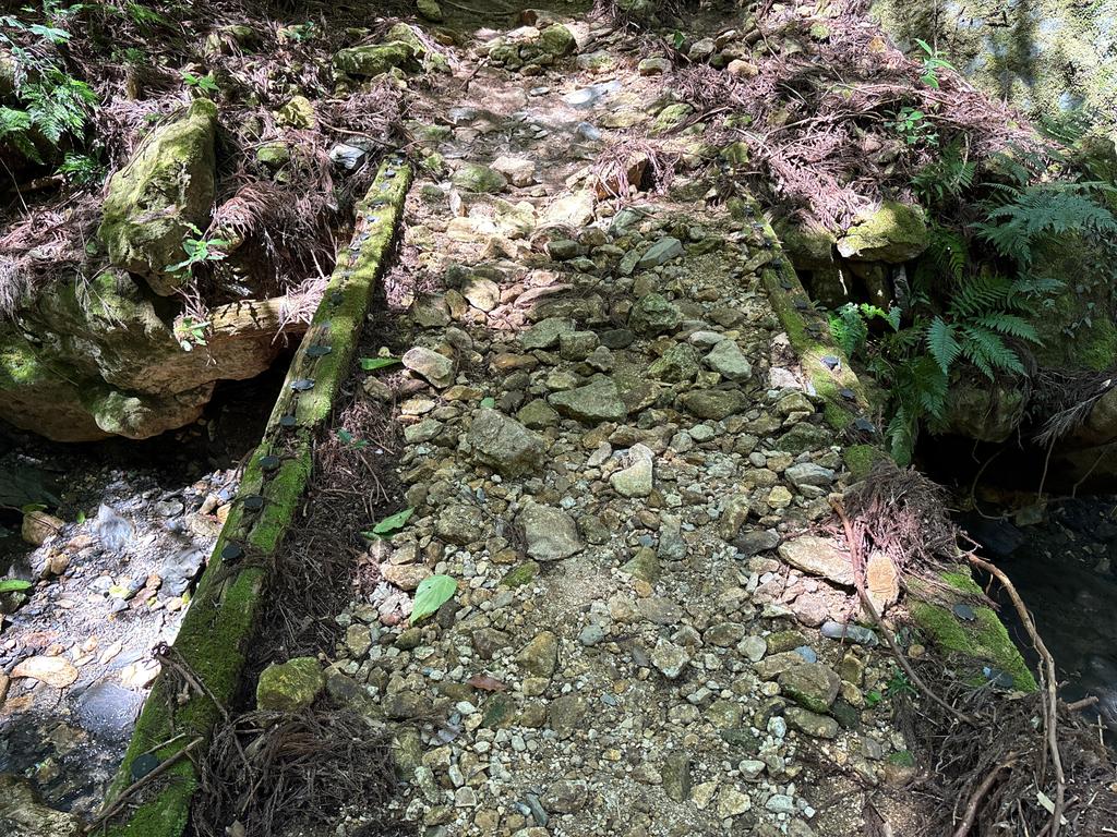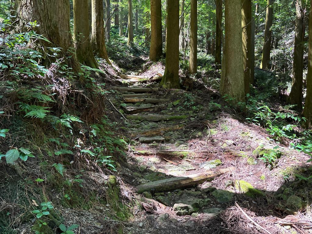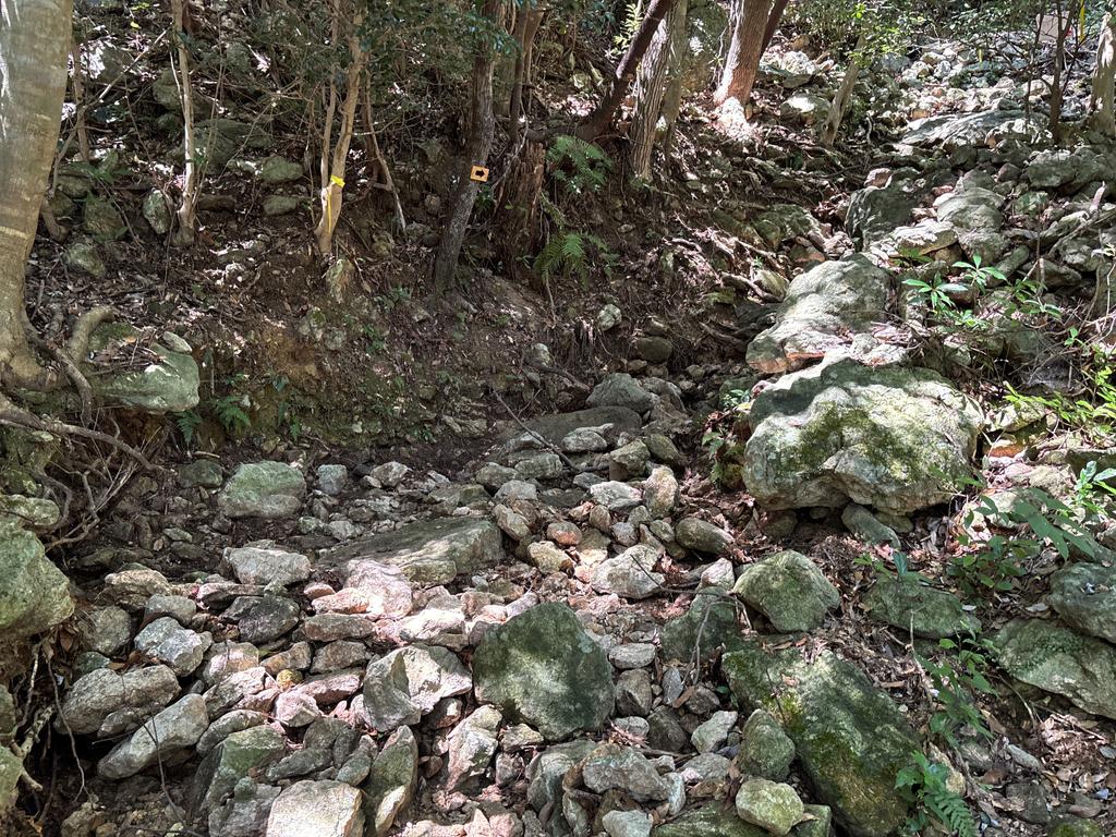 水量が多い場所なので、百キログラム単位の石で登山道を補強する必要がありそうですが、重機は入らず、チェーンブロックとか荷締め機などの特殊な機材が必要そう。