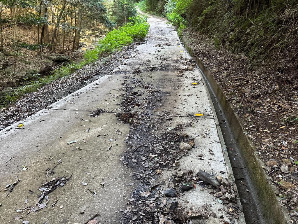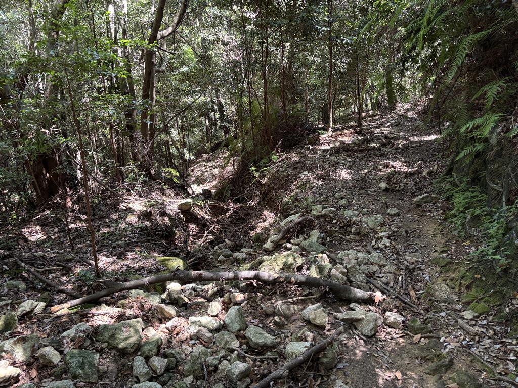 整備してない登山道には、山側から水が流れこみ、落ち枝が堆積していました。