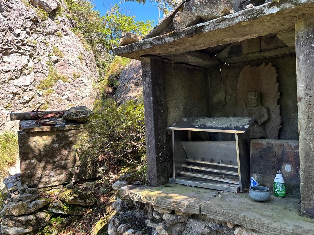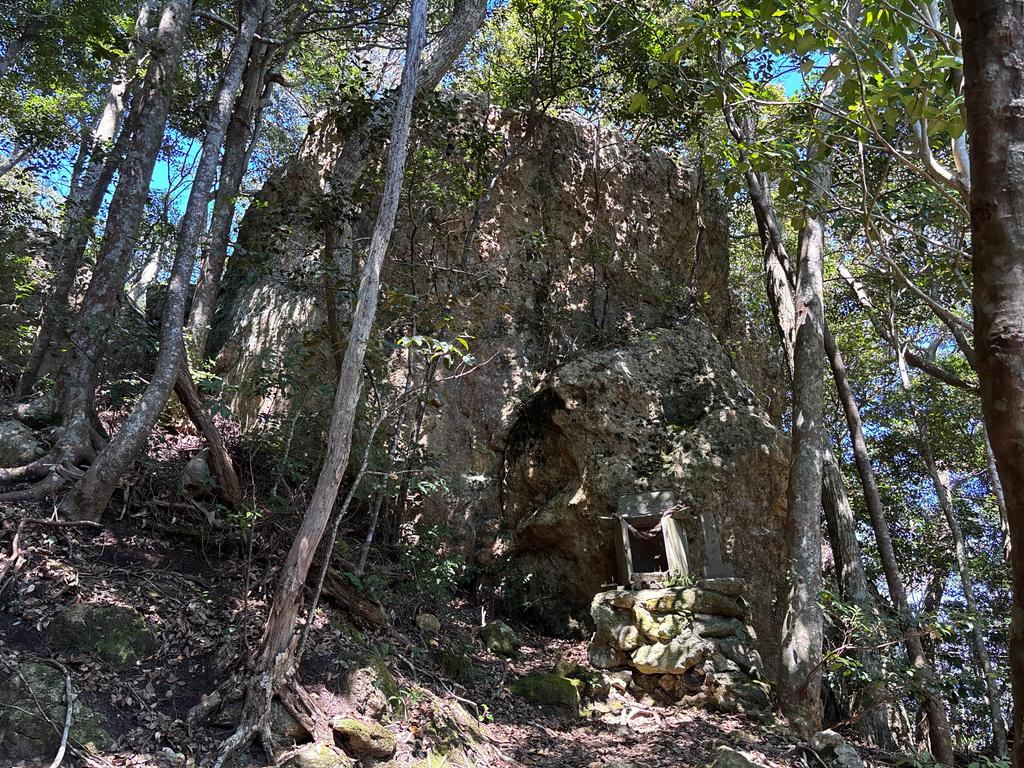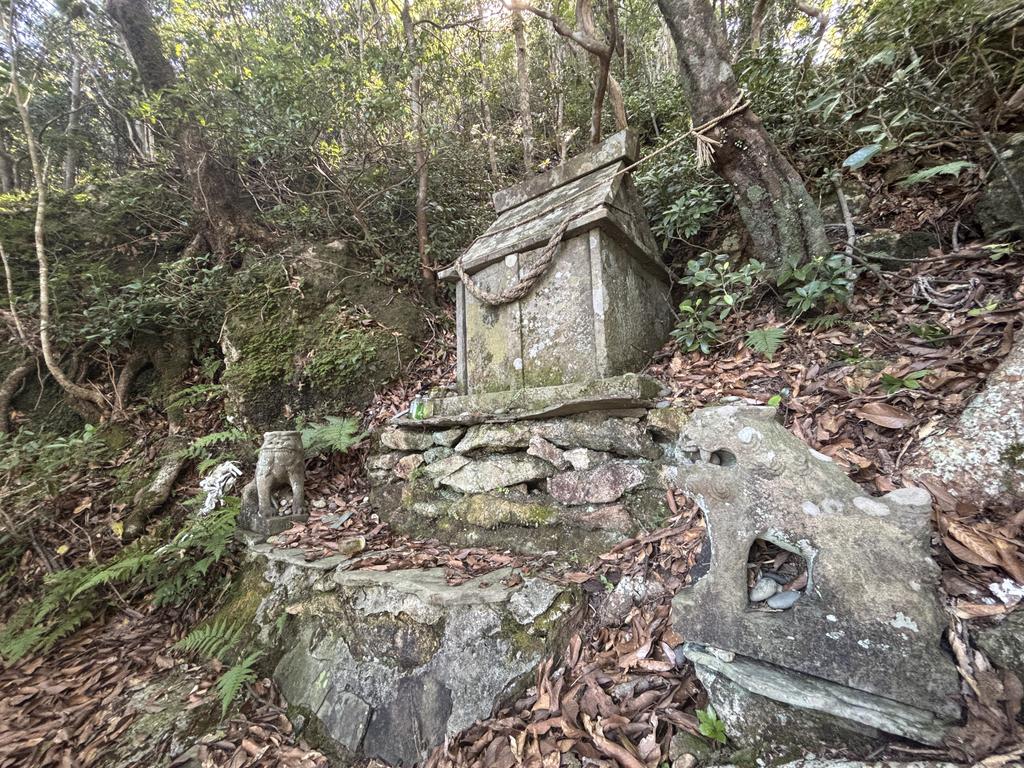 鞍部の祠(ほこら)です。左の祠の上には、漁師さんが奉納した碇(いかり)が乗っています。