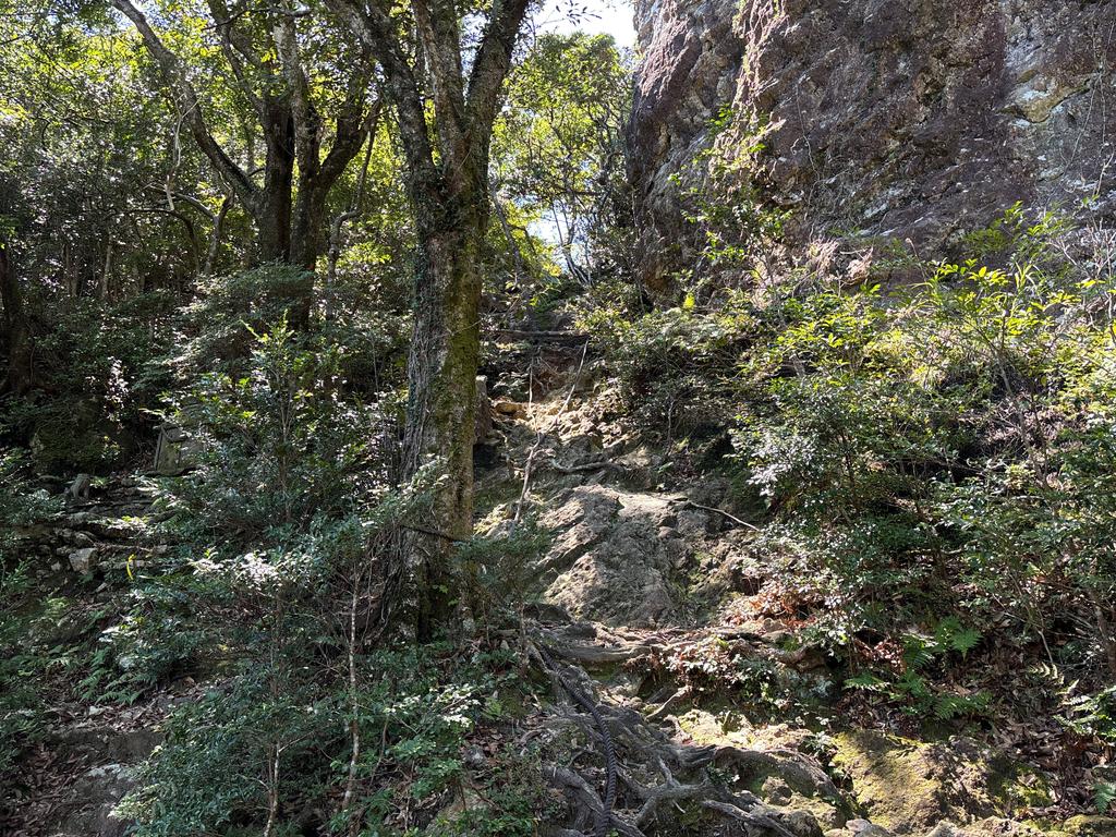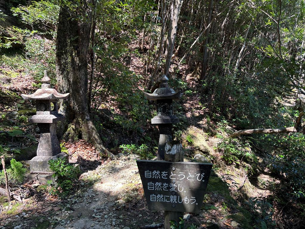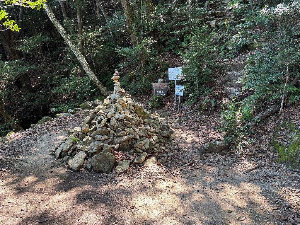 雄岳山頂(斜面を登る)と、休憩所の「岩のテラス」(石灯籠の先へ平行に進む)の分岐点です。