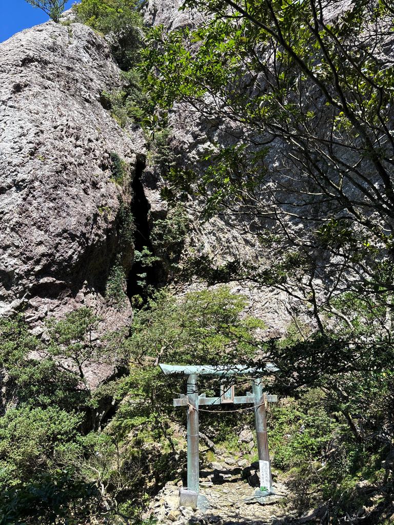 雌岳。岩窟があり、その下に緑青色の鳥居があるのがわかりますか?