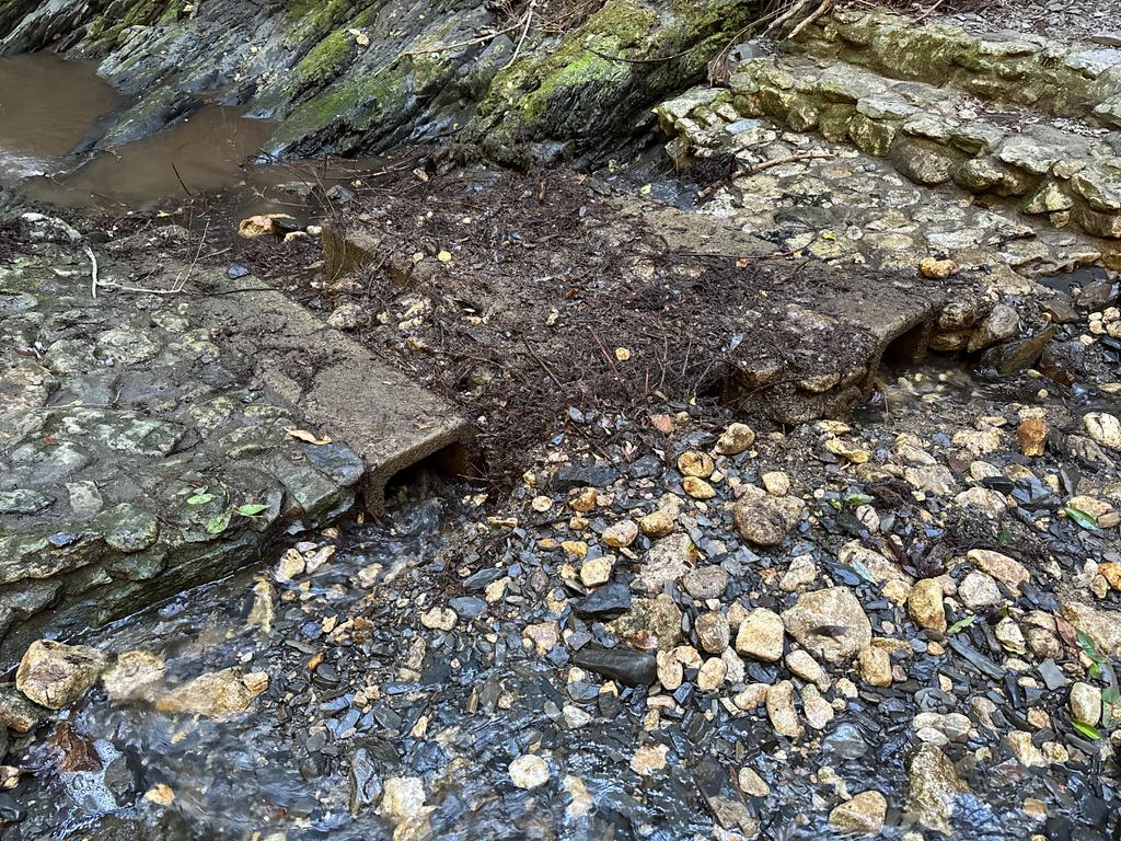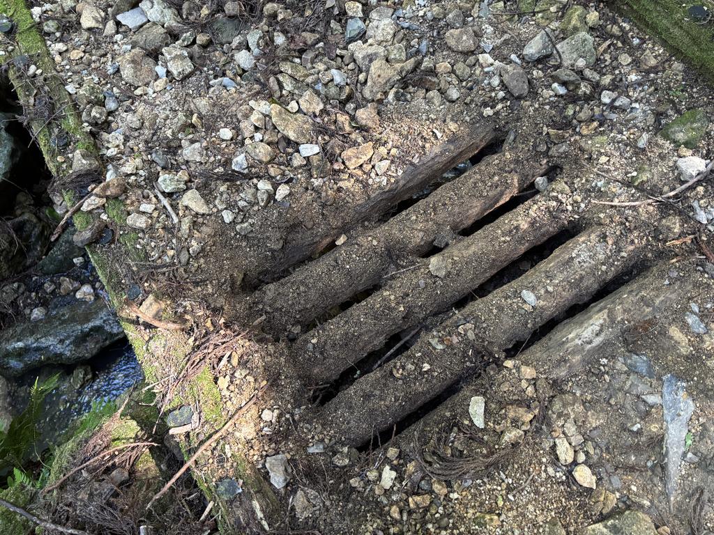 いつもの要メンテ箇所その1。U字溝の橋?に枝が詰まり、水が溢れています。