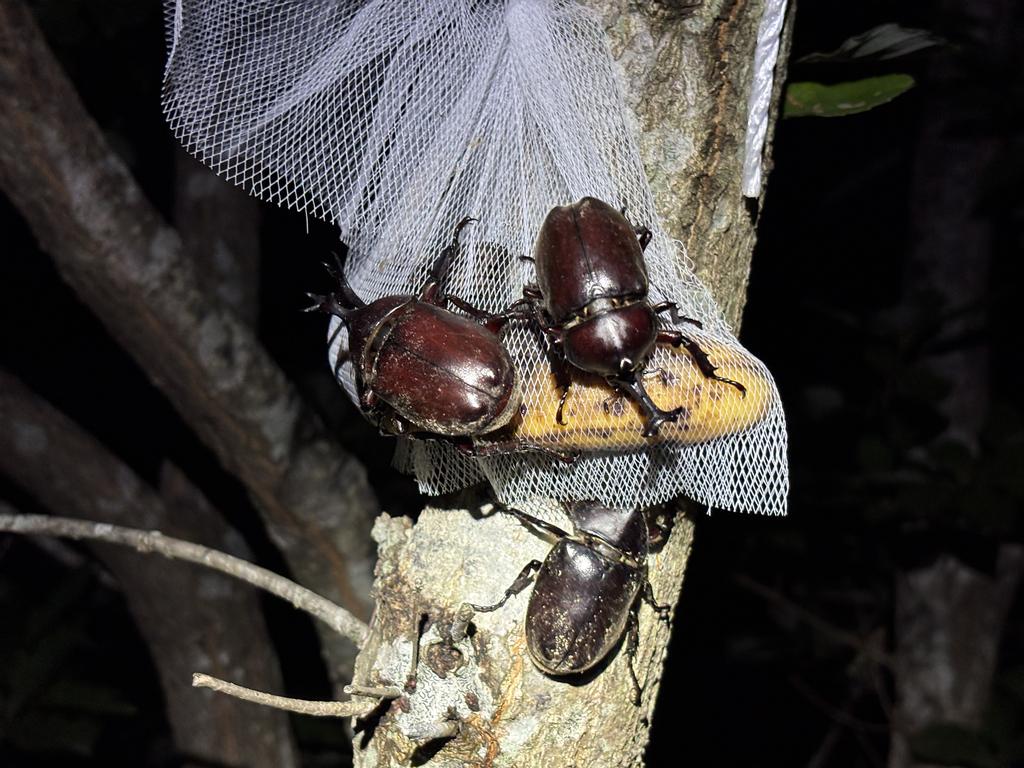 夕方にバナナをセットすると、その夜には現れるカブトムシ。図体に似合わず飛翔力があり、ヘッドライトに向かって飛んできたりします。