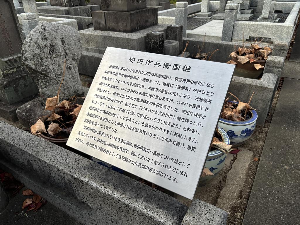 なんと、「本能寺の変」で織田信長に一番槍をつけ、森蘭丸を討ったと伝わる安田作兵衛国継のお墓がありました。明智光秀の家臣で、槍の名手だったそうです。