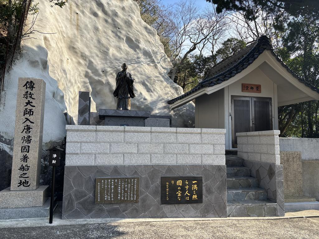 途中、「伝教大師入唐帰国着船之地」の石碑と、新たに設置された最澄さんの銅像を見学。