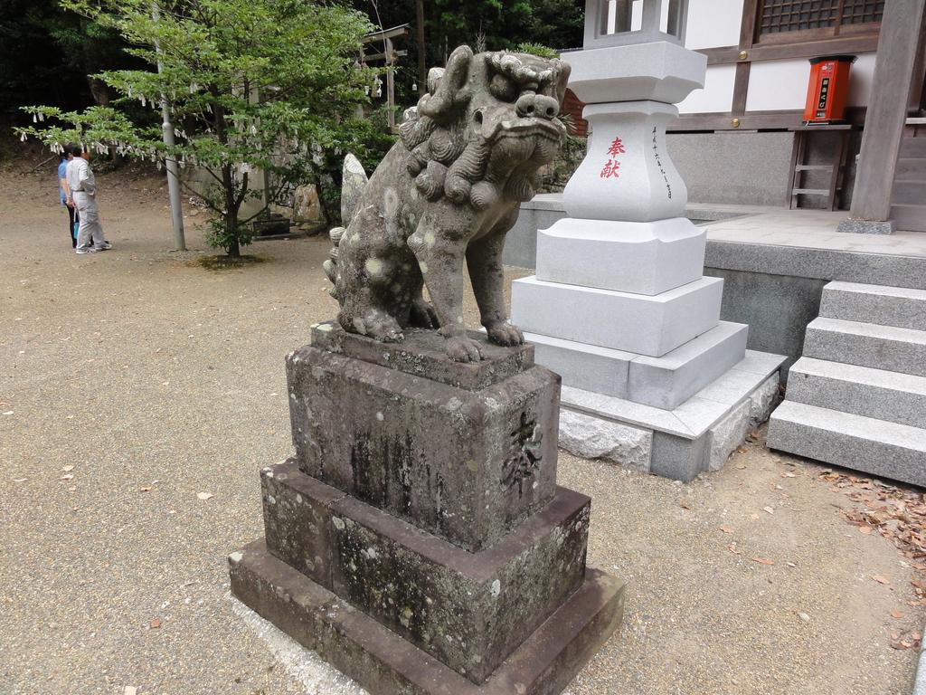 美津島町加志の太祝詞神社にある、「石工 有江政雄」の狛犬(昭和13年)は、目鼻が大きく、手足が短く、ユーモラス。
