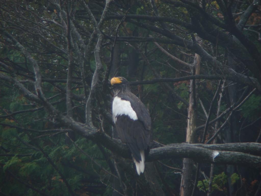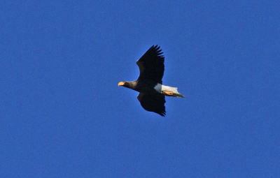 こんばんは。今日は上に遠征しました。目的のオオワシは無事発見できました。「うんこ」をしたり、頭を掻いたり、大声で鳴いたりして最後に飛び立ってどこかへ行ってしまいました。