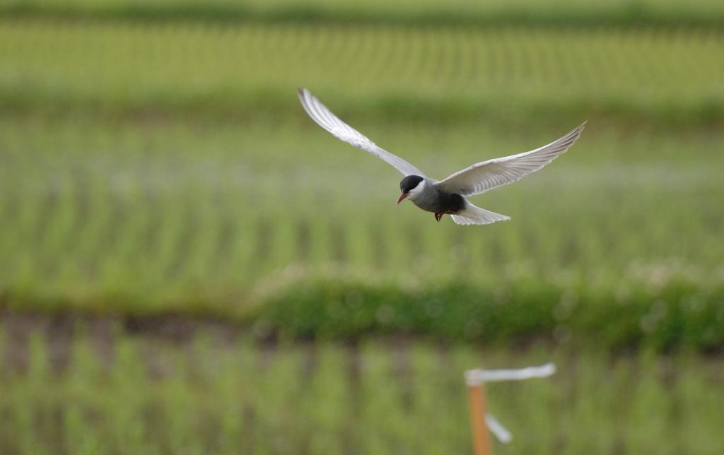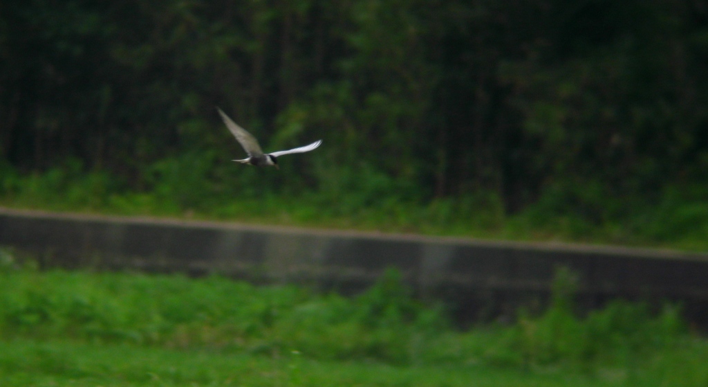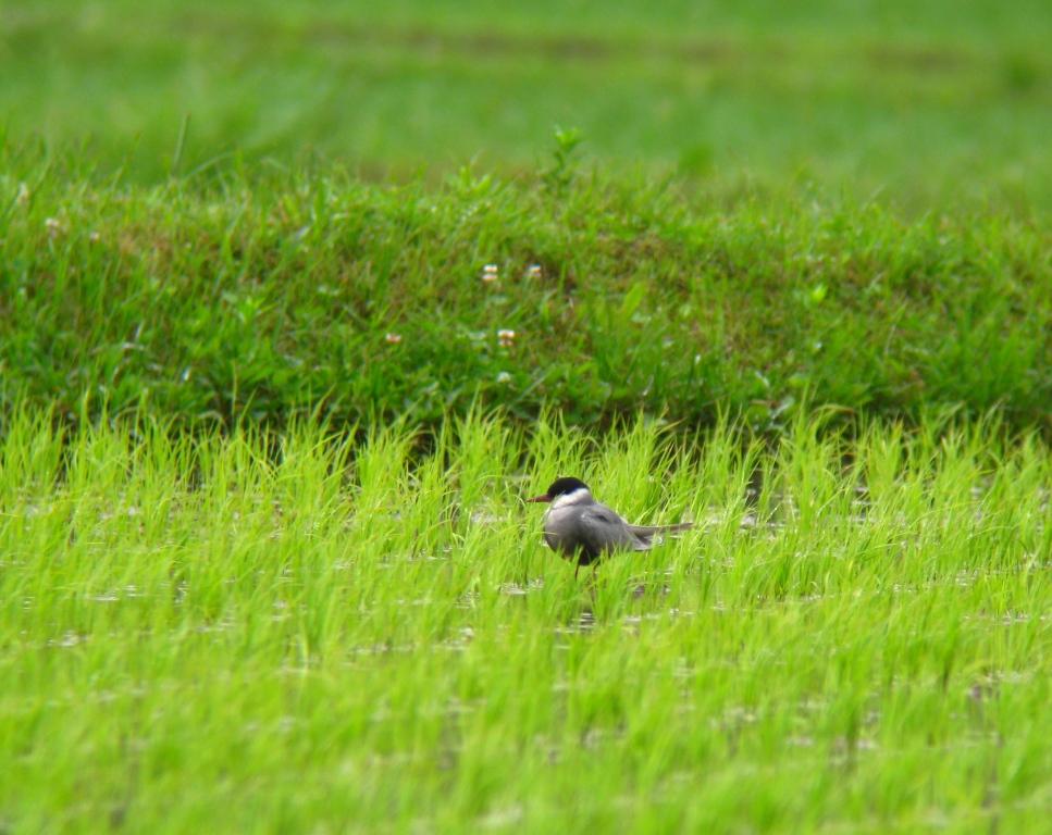 今日は朝K口氏からクロハラアジサシがいると電話があり、早速駆けつけました!!ふわふわと飛んでいました。頑張ってデジスコで狙ってみたのですが・・・仕方なく双眼鏡で観察をすることに。するとなんと田んぼにとまってくれたのです!!アジサシが田んぼにいると何か不思議ですね〜☆