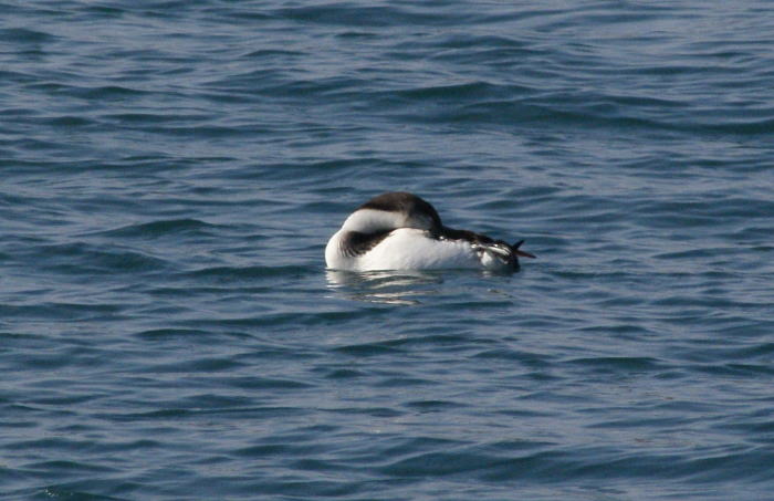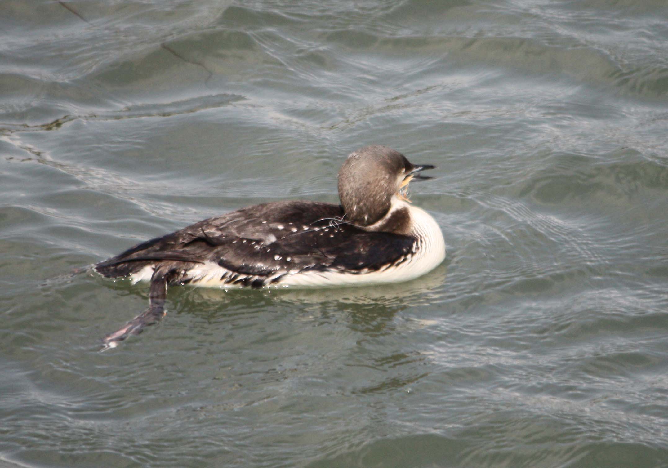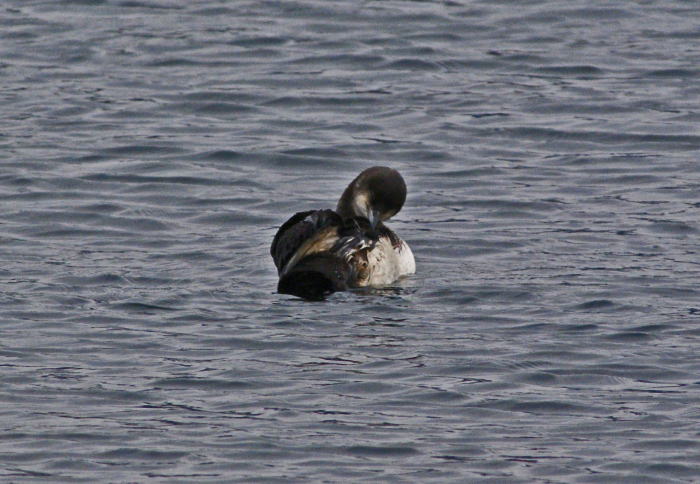 こんばんは。尾崎の港の中にシロエリオオハムが1羽いました。右の後ろの方が汚れているらしく盛んに嘴で落としていました。○やさんこれで報告に代えます。よろしくです。沖の方にはきれいなアビ類が数羽いましたが遠すぎて正確な数はわかりませんでした。