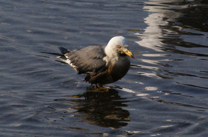 最近になって汚染鳥が各地で目撃されるようになってきましたね。1枚目のシロエリオオハムも一見するときれいに見えますが、どこかに油が付着しているのでしょう…。2枚目のウミネコもべっとりついて痛々しいですね。