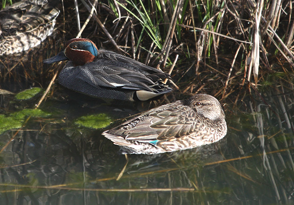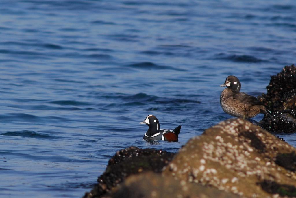 越高の漁港にシノリガモが2羽いました。最初はペアかと思いましたが、メスではなくオスの若のようです。