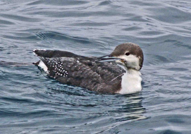 こんばんは。海鳥の調査に行きました。今年はアビ類が少なく内心喜んでいましたが、阿連でオオハムが2羽、シロエリオオハムが4羽波の静かな所にいました。オオハム1羽とシロエリオオハム2羽が盛んに嘴で羽繕いをしていました。残りは盛んに潜って餌採りに精を出していましたが、全く着いていないとはいえません。加志にはカモメ類が30羽くらいいましたが中のウミネコ1羽がかなり汚れていました。